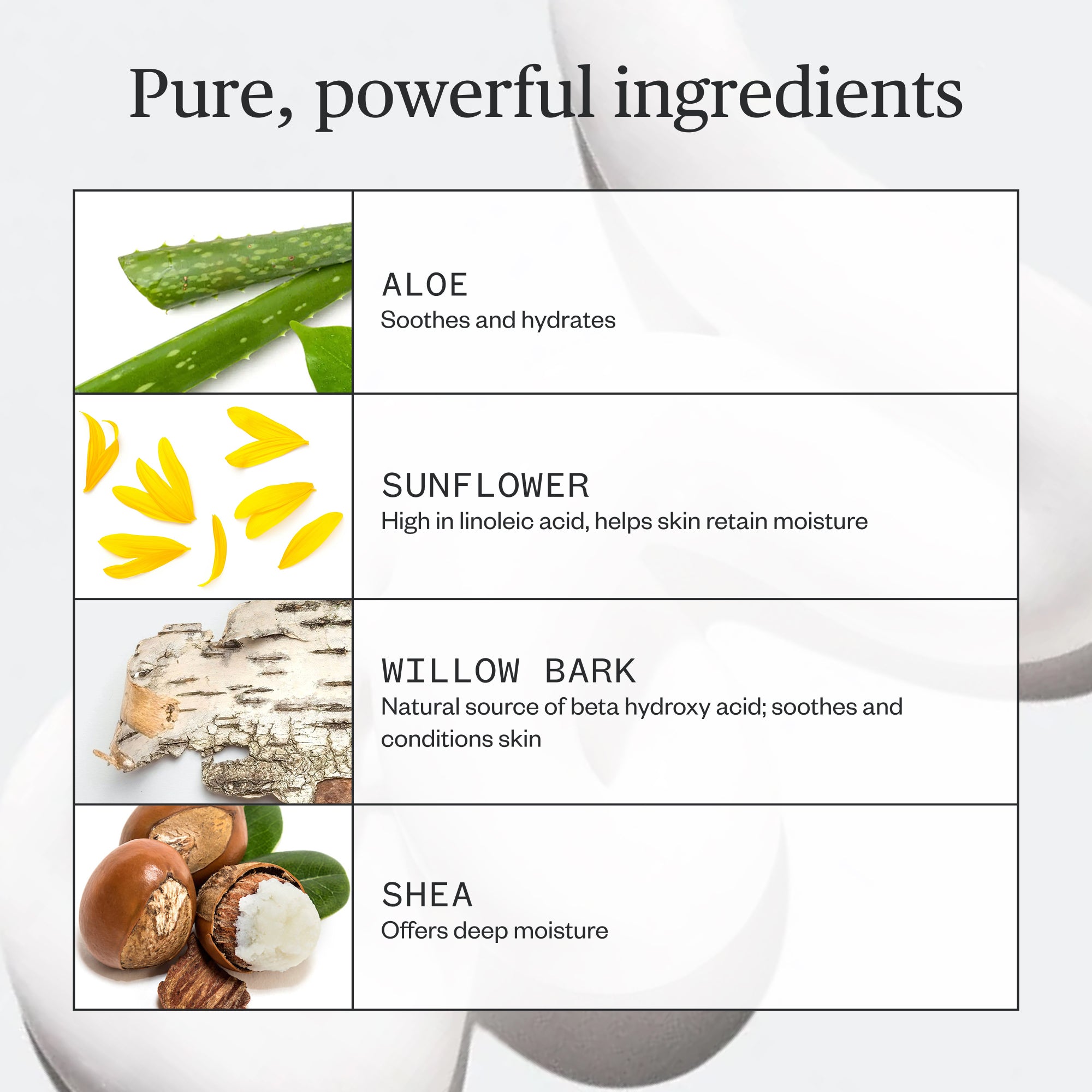 Aloe Barbadensis (Aloe Vera) Leaf Juice, Water/Aqua/Eau, Helianthus Annuus (Sunflower) Seed Oil* , Zinc Oxide Powder, Cetearyl Alcohol, Cetearyl Glucoside, Glycerin, Salix Nigra (Willow) Bark Extract, Avena Sativa (Oat) Protein, Galactoarabinan, Butyrospermum Parkii (Shea) Nut Butter, Betula Alba (Birch) Sap, Arachidyl Alcohol, Behenyl Alcohol, Arachidyl Glucoside, Crithmum Maritimum Extract, Citrus Paradisi (Pink Grapefruit) Peel Oil, Zingiber Officinale (Ginger) Root Oil* , Vetiveria Zizaniodes (Vetiver) Root Oil, Pseudotsuga Menziesii (Fir) Needle Oil, Abies Balsamea (Fir Balsam) Oil* , Citrus Bergamia (Bergamot) Peel Oil, Santalum Spicatum (Sandalwood) Wood Oil, Cananga Odorata (Ylang Ylang) Flower Oil, Tanacetum Annuum (Blue Tansy) Flower Oil, Picea Mariana (Black Spruce) Needle Oil* , Viola Odorata (Violet) Leaf Oil, Nardostachys Chinensis (Spikenard) Root Oil, Abies Grandis (Grand Fir) Needle Oil* , Rosmarinus Officinalis (Rosemary) Leaf Extract*, Potassium Sorbate, Xanthan Gum, Dehydroacetic Acid, Benzyl Alcohol, Citric Acid (* Denotes Organic)