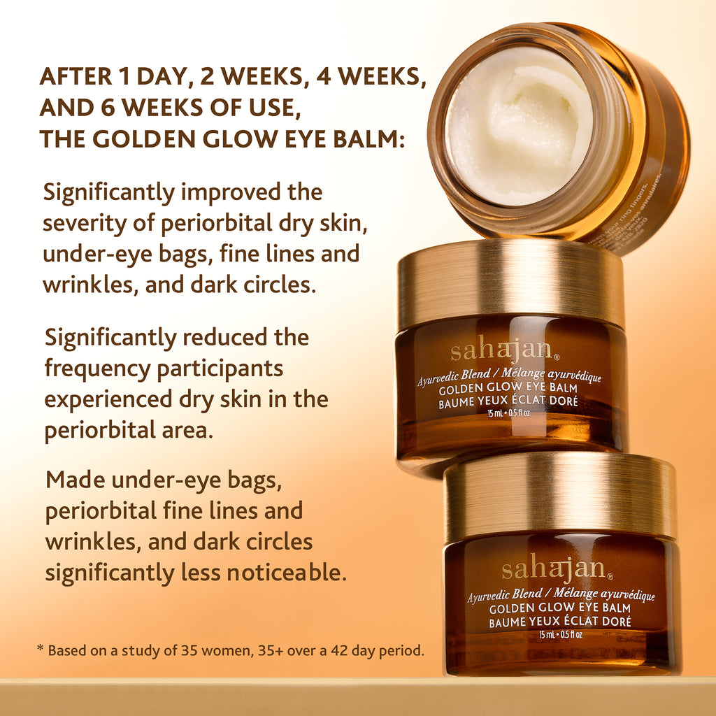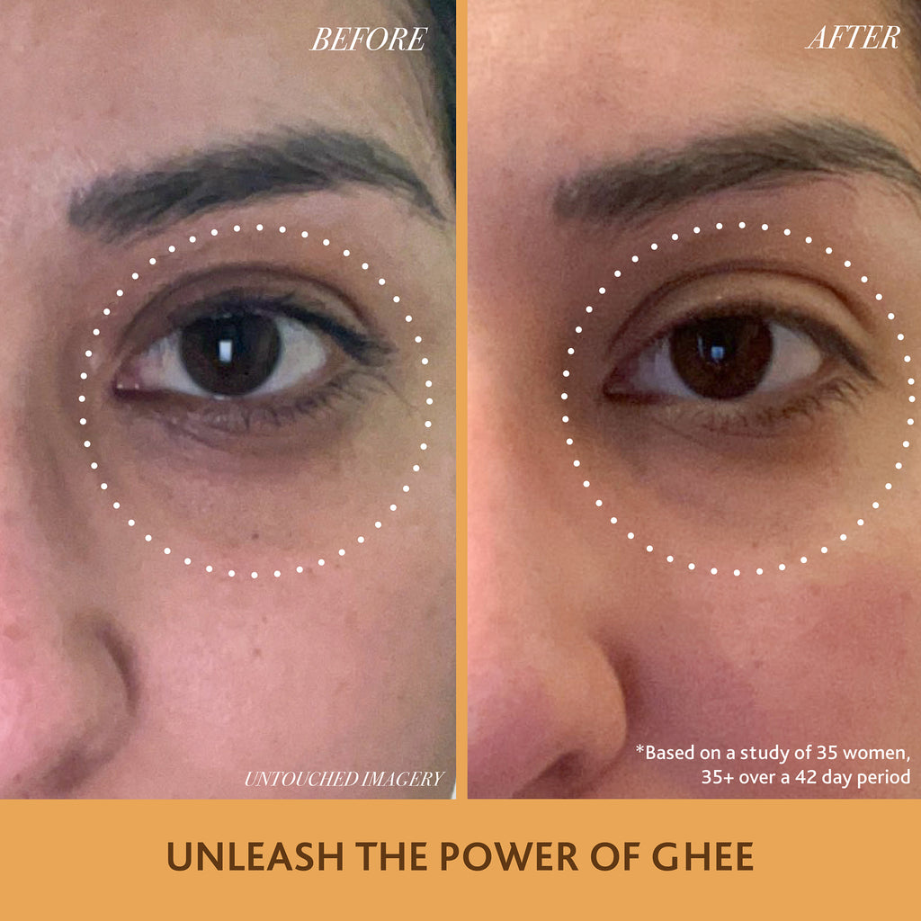 The delicate skin around the eyes is more fragile, up to 5x thinner than the rest of the skin, more prone to dryness and quicker to show the signs of fatigue, stress and environmental factors. Enter Ghee, Ayurveda’s liquid gold, rich in fatty acids and antioxidants and revered for its ability to soften dark circles and help soothe the undereyes. We have harnessed the power of ghee in this thick, masque- like balm and added eyebright and gotu kola to help visibly reduce the signs of fatigue and diminish the dark circles and rose oil to help improve skin elasticity and firmness.