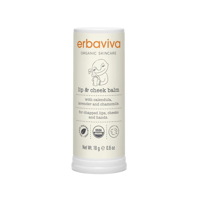 Erbaviva's certified organic Lip & Cheek Balm is the perfect on-the-go skin treatment for dry or chapped skin. Antioxidant-rich calendula and rosemary extracts heal and strengthen skin while also forming a protective barrier against free radicals. Shea butter alleviates pain, dryness, and redness, by locking in and maintaining the much-needed moisture. Organic essential oils lavender and chamomile soothe and and calm irritated skin and mood. Safe to use on babies to shield delicate skin from dry and cold weather.