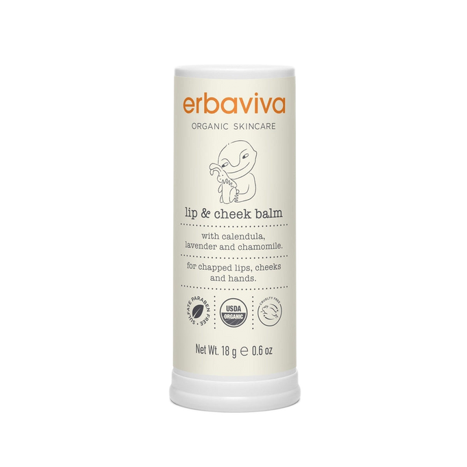 Erbaviva's certified organic Lip & Cheek Balm is the perfect on-the-go skin treatment for dry or chapped skin. Antioxidant-rich calendula and rosemary extracts heal and strengthen skin while also forming a protective barrier against free radicals. Shea butter alleviates pain, dryness, and redness, by locking in and maintaining the much-needed moisture. Organic essential oils lavender and chamomile soothe and and calm irritated skin and mood. Safe to use on babies to shield delicate skin from dry and cold weather.