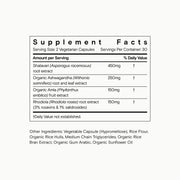 Shatavari (Asparagus Racemosus) Root Extract, Organic Ashwagandha (Withania Somnifera) Root And Leaf Extract, Organic Amla Berry Extract (Phyllanthus Emblica), Rhodiola Rosea Root Extract (3% Rosavins & 2% Salidrosides), Rice Flour, Capsule (Hypromellose), Organic Rice Hulls, Medium Chain Triclycerides, Organic Rice Bran Extract, Organic Gum Arabic, Organic Sunflower Oil.